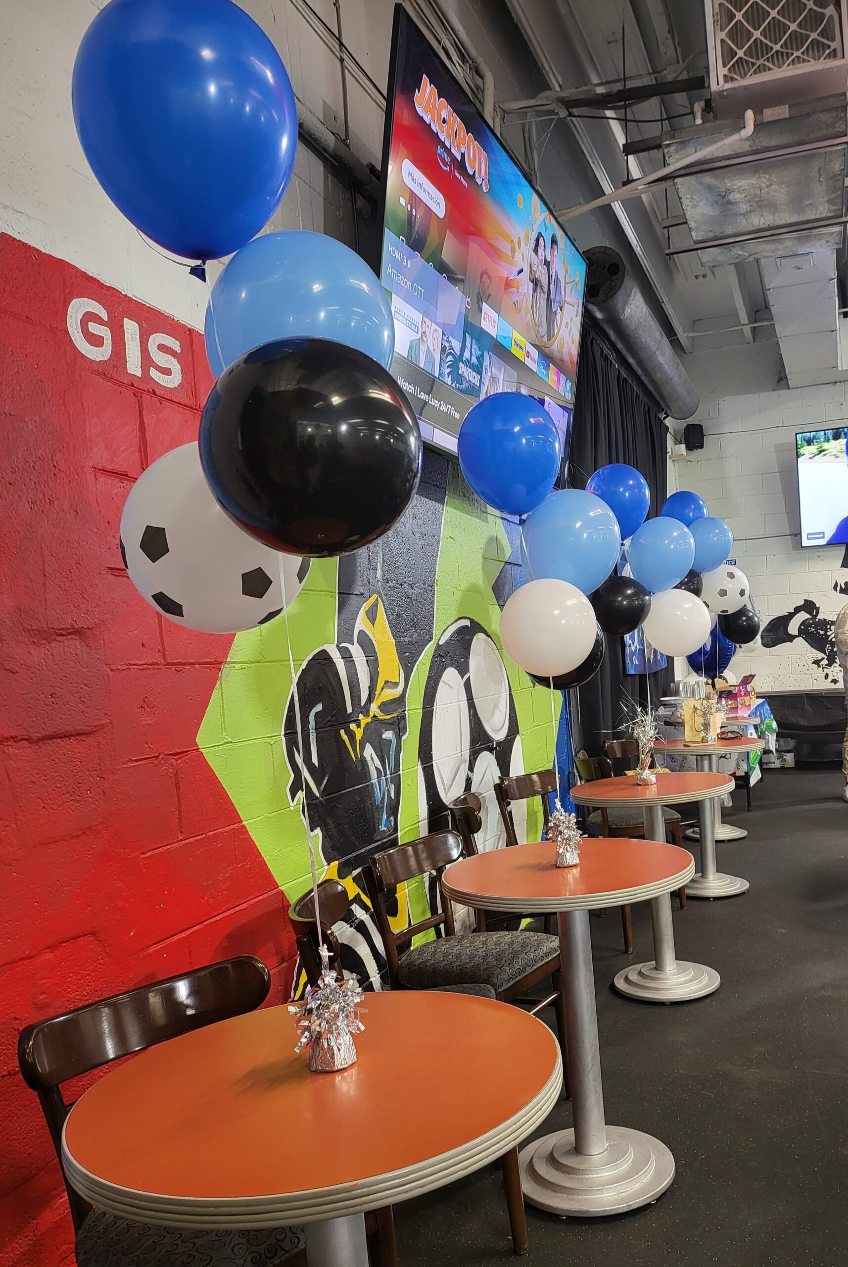 Standard decoration with assorted plain + helium- inflated baloons, paper plates, cups, napkins, plastic utensils, and one cooler with ice.