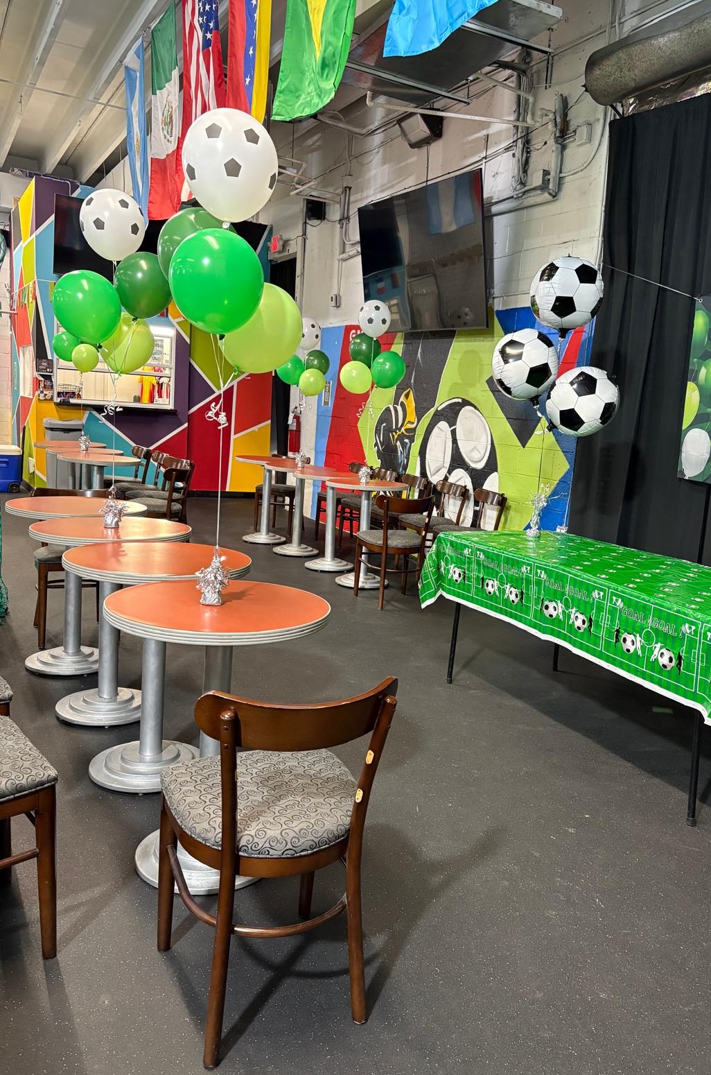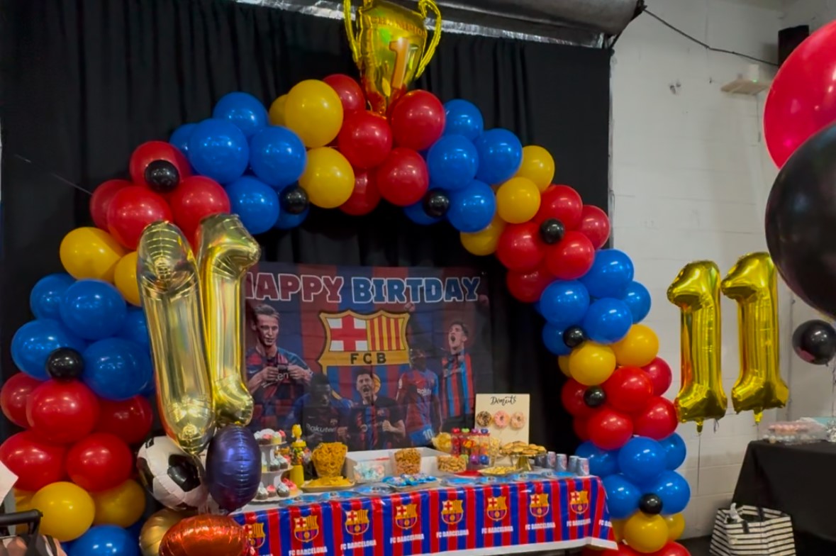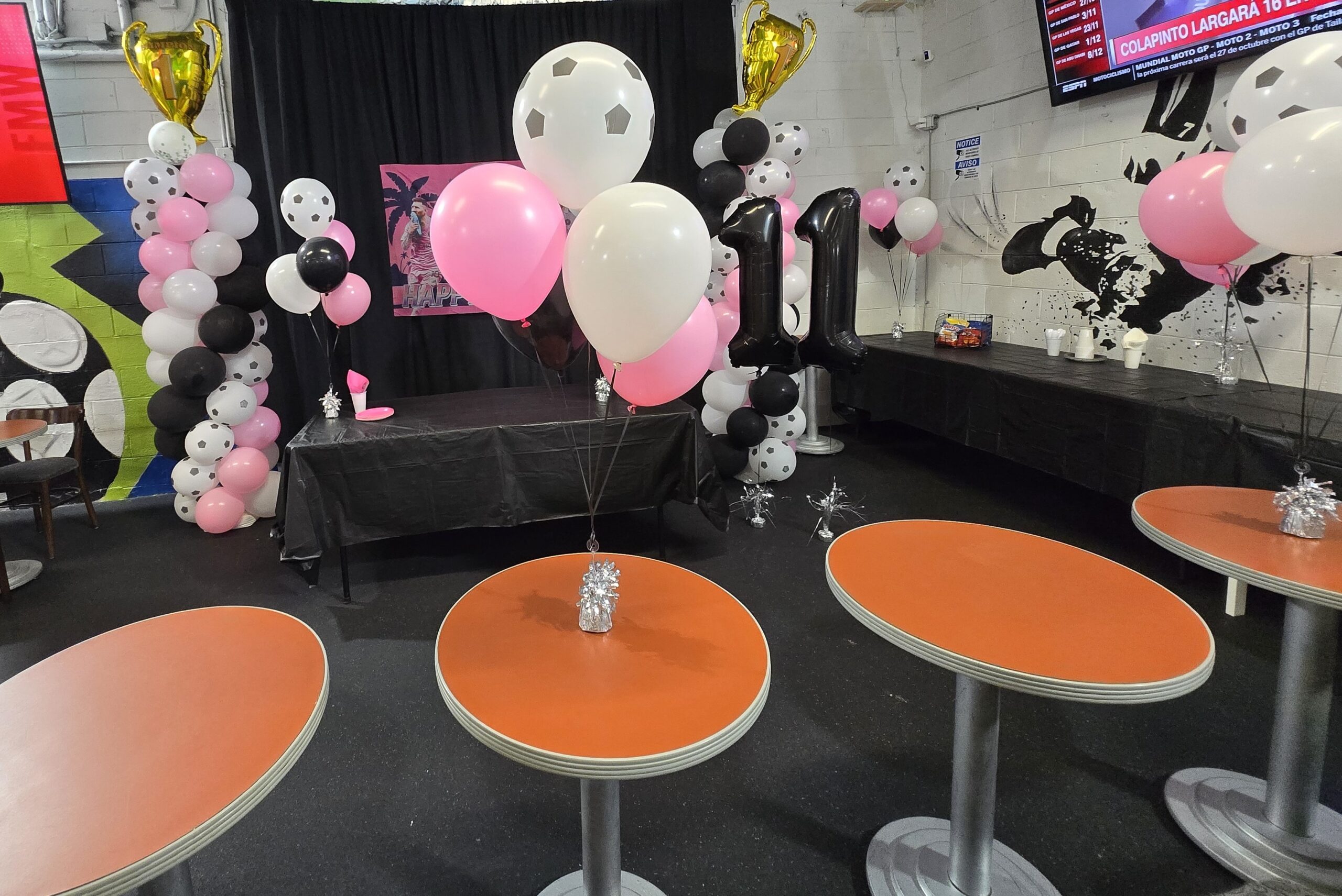 Basic decoration with assorted plain + helium- inflated baloons, paper plates, cups, napkins, plastic utensils, and one cooler with ice.